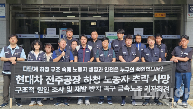 현대자동차 전주공장에서 하청노동자가 5.6m 아래로 추락해 숨진 사고를 두고 전북지역 금속노조가 노동부의 재발방지 대책 마련을 촉구했다.