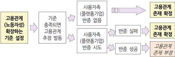 여기서 좀 생소하게 느껴지는 '고용관계 추정 제도'를 설명할 필요가 있다. 간단하게 개요를 정리하자면 ⒜기존 고용관계(노동자성) 개념을 확장하기 위해 ⒝일정 기준을 정해서 이 기준을 충족하면 고용관계 존재를 추정하고, ⒞만일 이 추정이 마음에 들지 않는 이가 반증에 성공할 경우에만 고용관계가 부정되도록 한 제도이다. (아래 그림)