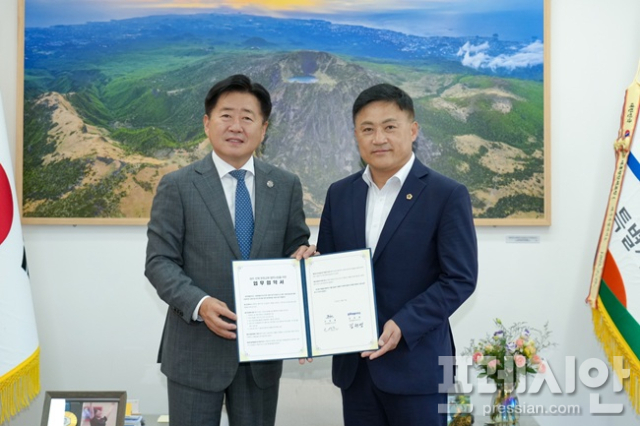 ▲오영훈 제주특별자치도지사(왼쪽)와 김정기 전북도의원(더불어민주당·부안)이 협약서를 들고 기념촬영을 하고 있다. ⓒ제주특별자치도