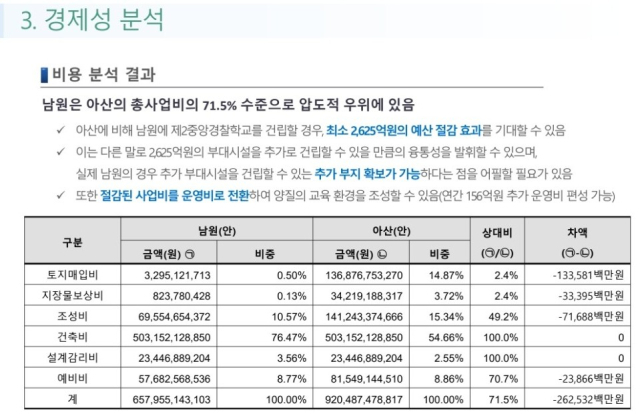 남원시에 제2중앙경찰학교를 설립하는 것이 충남 아산시에 짓는 방안보다 2600억원 이상 비용을 절감할 수 있는 셈이다.