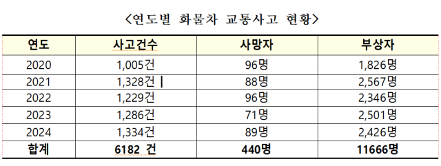 안 의원이 분석한 자료에 따르면, 2020년부터 2024년까지 최근 5년간 고속도로에서 발생한 화물차 교통사고는 총 6,182건으로 집계됐다. 이로 인해 발생한 사상자는 11,666명에 달하며, 이 가운데 사망자는 440명에 달하는 것으로 확인됐다.