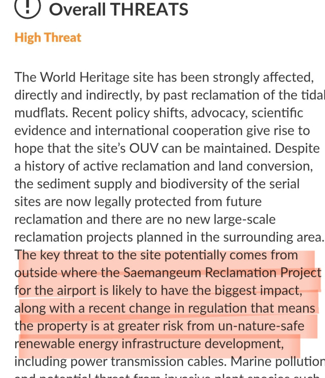 보고서는 주요 외부 위협 요인과 관련해 "가장 큰 잠재적 위협은 새만금 간척사업으로, 특히 공항 건설 계획이 해당 지역에 중대한 영향을 미칠 가능성이 있다"고 언급했다.
