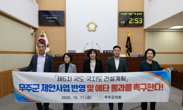 무주군의회는 ▲기획재정부와 국토교통부가 무주 안성 ~ 적상 4차로 확장, 무주 무풍 ~ 김천 대덕, 무주 설천 심곡 ~ 두길 2차 개량사업을 제6차 국도·국지도 건설계획 일괄예비타당성 조사에서 반드시 통과되도록 신속히 조치할 것을 건의했다.
