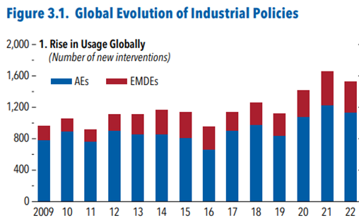 아래 그래프는 IMF가 지난 8월에 내놓은 "산업정책 : 성장과 복원의 트레이드오프(trade-off) 관리하기"라는 페이퍼에 등장하는 그림이다. 선진국(AE)과 개발도상국(EMDE)에서 새롭게 채택된 산업정책의 개수를 연도별로 나타낸 것이다. (참고로 중국은 개발도상국으로 분류됨)