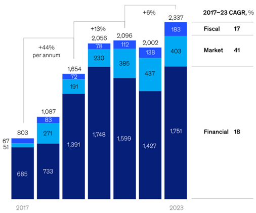 분석 대상을 무역이 활발한 국가들(한국, 미국, 중국, 유럽연합(EU), 일본, 브라질, 캐나다, 인도, 호주, 러시아, 아랍에미리트연합(UAE), 사우디아라비아)로 좁혀서 보면 더 놀라운 결과를 확인할 수 있다. 2023년에 이들 나라가 채택한 산업정책의 수(2337개)는 6년 전인 2017년(803개)과 비교했을 때 무려 3배가 늘어난다.