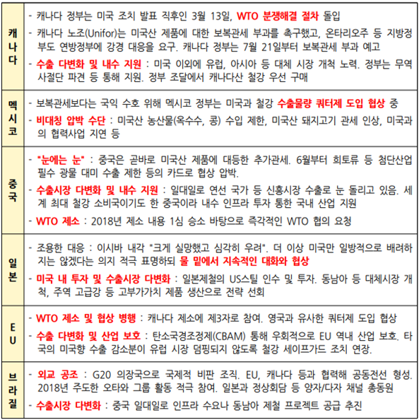 특히 미국으로 수출하는 상품에 보편적으로 붙는 '상호관세'보다 특정 산업 제품에 붙는 '품목별 관세'는 모든 정부들이 해당 산업에 맞춤형 대책을 내놓도록 촉발했다. 현재까지 시행 중인 품목별 관세는 철강·알루미늄과 자동차·부품이며, 미국은 조만간 반도체와 의약품에도 품목별 관세를 확대할 계획임을 밝힌 바 있다.