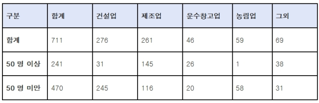 고용노동부가 ‘폭염 안전보건 규칙’에 따라 지난 7월 17일부터 8월 31일까지 전국 사업장을 감독한 결과, 위반 사업장은 711곳, 위반 건수는 780건에 달했다. 이 중 50인 미만 영세 사업장이 470곳(66%)으로 가장 많았고, 업종별로는 건설업(38.8%)과 제조업(36.7%)에서 집중적으로 발생했다.