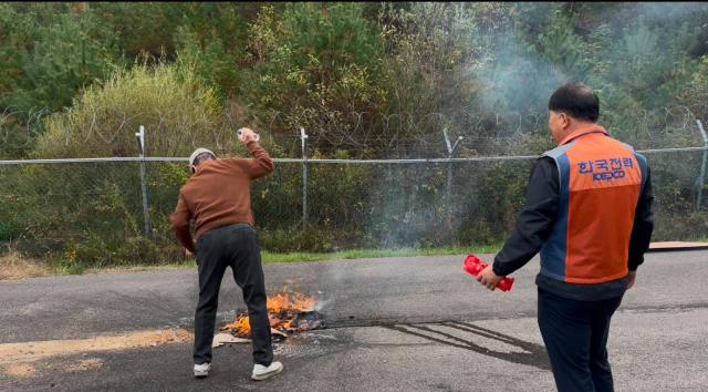 이날 한전 사회봉사단은 노년층이 많은 지역주민들에게 화재 발생 시 쉽게 사용할 수 있는 투척용 소화기(160개)를 비롯해 일반 분말형 소화기(80개), 화재경보기(60개)를 전달했다.