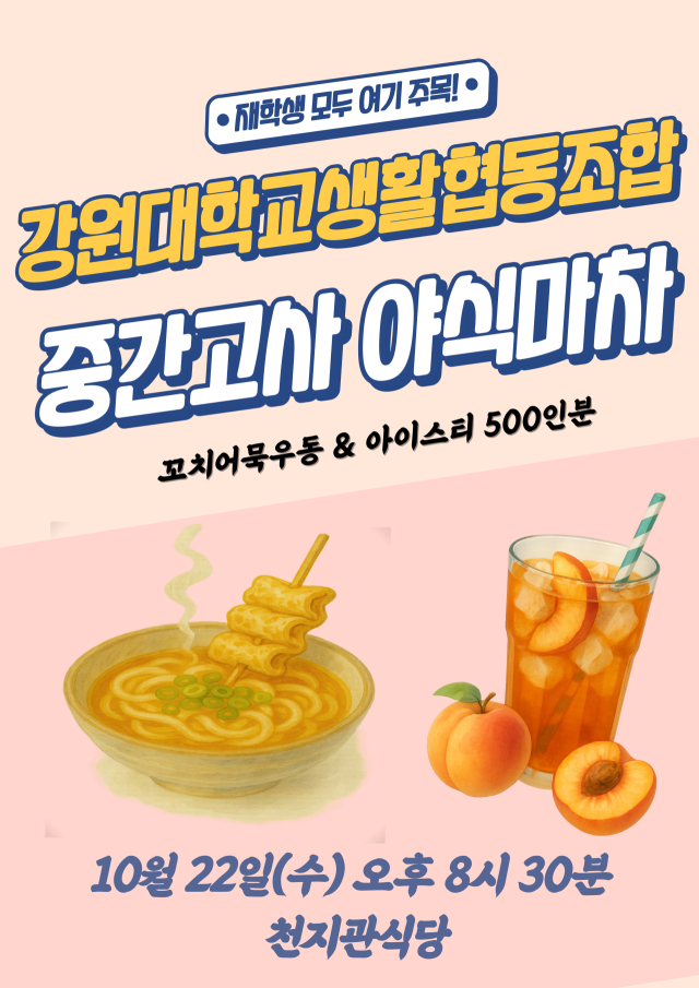 강원대학교(총장 정재연) 생활협동조합은 22일 오후 8시 30분부터 춘천캠퍼스 천지관 학생식당에서 중간고사 기간을 맞은 학생들을 위한 ‘열공 야식마차 행사’를 개최했다.