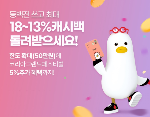 오는 29일부터 다음달 9일까지 진행되는 '코리아 그랜드 페스티벌' 기간에는 캐시백 요율을 한시적으로 최대 18%까지 인상하고 50만 원의 별도 한도를 추가 적용한다. 이에 따라 11월 한 달 간은 총 100만원 사용 시 최대 15만5000원의 환급이 가능하게 된다.
