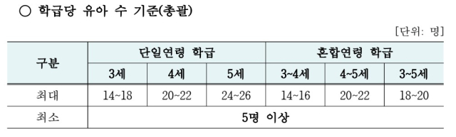현재 시·도별로 다소 차이는 있으나, 현재 유치원, 어린이집의 유아 수 기준은 아래와 같다.