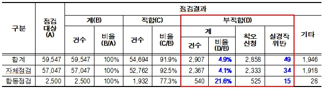 그러나 점검 결과를 보면 지자체 점검의 ‘부실’이 뚜렷했다. 지자체 자체점검의 부적합 적발 비율은 4.1%였던 반면, 농관원 합동점검의 부적합 적발 비율은 21.6%로 5배 이상 차이가 났다. 또한 실경작 위반 적발률 역시 자체점검은 0.06%, 합동점검은 0.6%로 10배 이상 격차를 보였다.