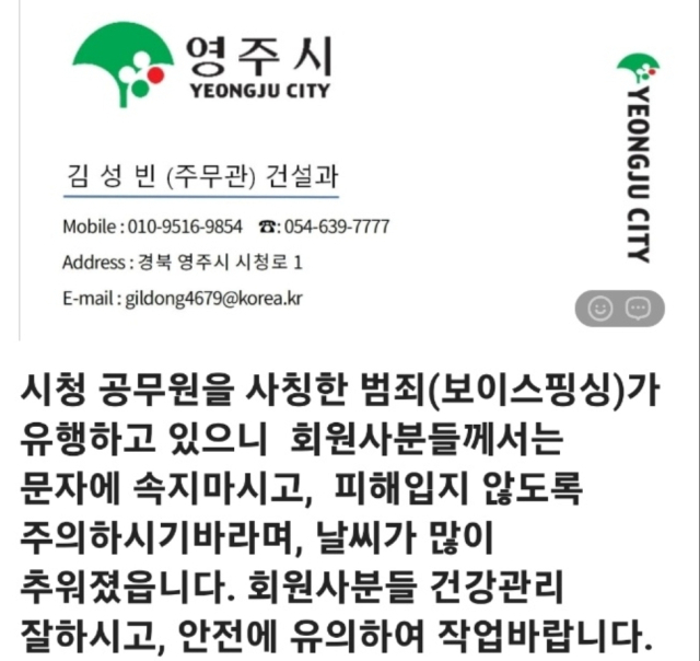 영주 지역에서 시청 공무원의 명함과 실명을 도용한 보이스피싱 사기가 잇따라 발생하면서 지역 건설업계와 납품업체에 주의가 요구되고 있다.