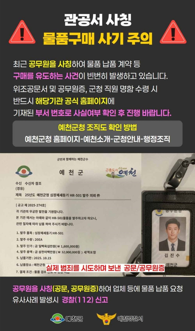 한편, 인근 예천에서도 유사한 범죄가 발생해 예천군과 예천경찰서에서는 긴급 안내문자를 발송해 피해를 예방하는데 주력하고 있다.