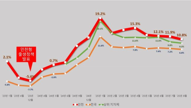 이는 전국 평균을 크게 웃도는 수치로, 수도권 내에서도 서울(9.3%), 경기(7.6%)를 앞질렀다. 대부분 지역이 한 자릿수 증가율에 머문 가운데, 인천은 유일하게 두 자릿수 상승세를 이어가며 수도권은 물론 전국의 출생률 회복 흐름을 주도하고 있다.