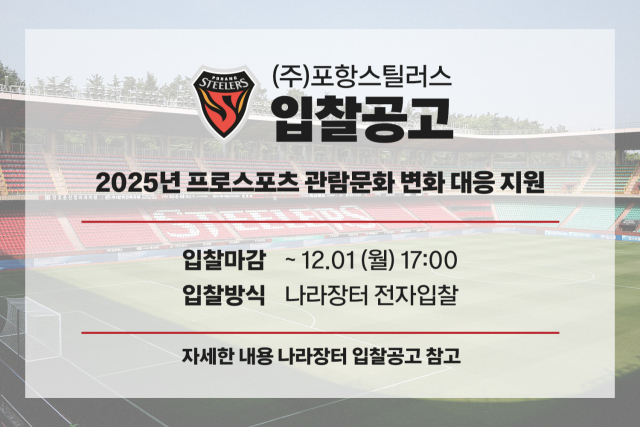 포항스틸러스는 ‘2025년 프로스포츠 관람 문화 변화 대응 지원’ 사업의 일환으로 스틸야드 내 노후화된 일반석을 프리미엄 좌석으로 교체하기 위한 용역 입찰을 진행한다고 밝혔다.