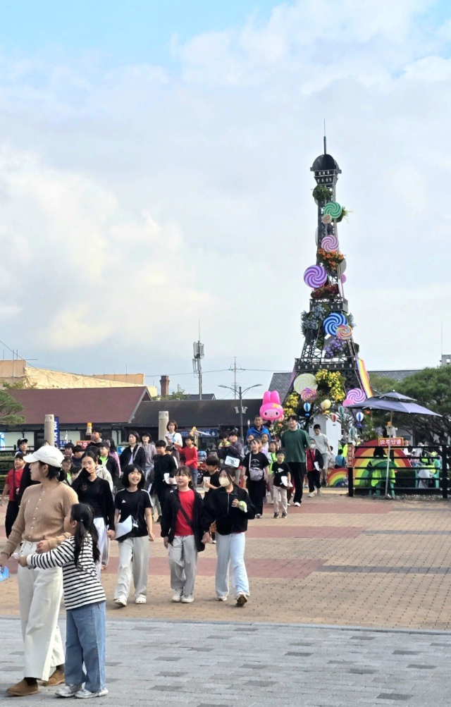 이번 축제는 곡성군이 육묘장에서 직접 가꾼 국화 화분을 곳곳에 배치했으며 에펠탑과 중앙무대는 형형색색의 사탕, 무지개, 열기구 장식으로 꾸며져 아이들의 상상력을 자극하는 공간으로 재탄생시켰다.