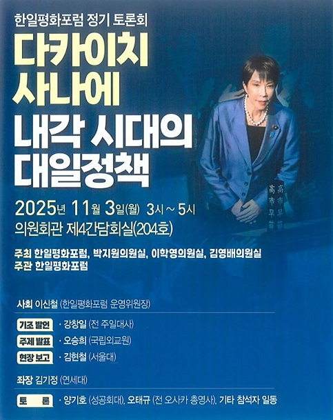 한편 한일평화포럼 정기토론회는 한일평화포럼과 박지원 의원실, 이학영 의원실, 김영배 의원실이 주최하고, 한일평화포럼이 주관했다. 토론회는 박지원 의원의 축사에 이어 강창일 전 주일대사의 기조발언, 오승희 교수의 주제 발표, 김현철 서울대 교수의 현장 보고가 이어졌고, 토론회 좌장은 김기정 연세대 교수가 맡았다.
