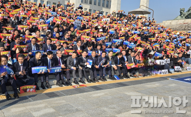 ▲4일 서울 여의도 국회의사당 앞에서 열린 ‘제2중앙경찰학교 남원 설립 촉구 범도민 결의행사’에서 김관영 전북특별자치도지사, 최경식 남원시장, 박희승 국회의원을 비롯한 도민 2000여 명이 ‘국가균형발전은 운명이다’, ‘제2중앙경찰학교는 남원으로’ 등의 구호를 외치며 남원 유치를 결의하고 있다. ⓒ프레시안(양승수)