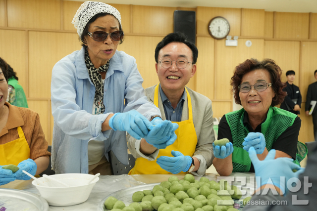 ▲윤병태 시장(가운데)이 봉황면부녀회 사랑의 송편나눔 행사에 참석해 직접 송편을 빚고 있는 모습.2025.09.10ⓒ프레시안