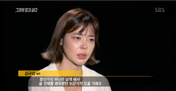이명박 정부 당시 작성됐던 '문화계 블랙리스트'의 피해자인 배우 김규리 씨가 국가정보원(이하 국정원)의 대국민 사과와 상고 포기를 환영한다면서도, 누구에게 사과하겠다는 것인지 명확하지가 않다며 아쉬움을 표했다.