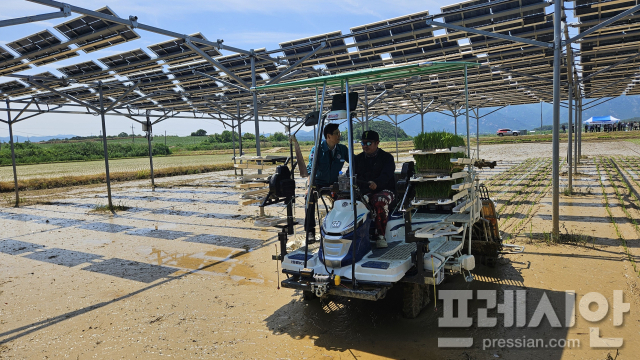 12일 군에 따르면 지난 2023년 농림축산식품부의 예산을 지원받아, 지난해 농업기술센터 직영 논 1000㎡ 면적에 45kW 규모의 영농형 태양광 설비를 설치하고, 지난 6월 11일 이앙을 시작으로 벼 재배와 태양광발전을 병행하는 실증재배에 나섰고, 최근 수확까지 마쳤다.