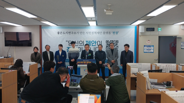 좋은도시연구소(소장 장기수)가 12일 천안시청 브리핑룸에서 기자회견을 열고 시민의 아이디어를 정책으로 발전시키는 참여형 플랫폼 ‘천장(天場: 천안광장)’을 공식 선보였다.