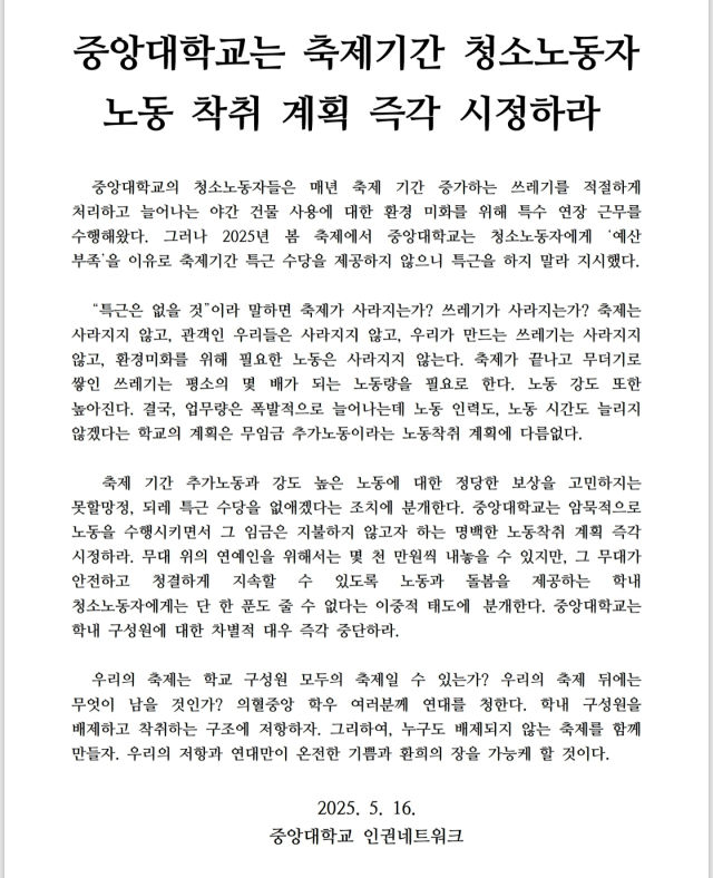 이어 "무대 위의 연예인을 위해서는 몇천만 원씩 내놓을 수 있지만, 그 무대가 안전하고 청결하게 지속할 수 있도록 노동과 돌봄을 하는 학내 청소노동자에게는 단 한 푼도 줄 수 없다는 이중적 태도에 분개한다"며 "중앙대는 학내 구성원에 대한 차별적 대우를 즉각 중단하라"고 했다.