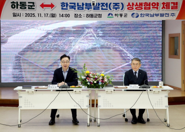 하승철 경남 하동군수와 김준동 한국남부발전㈜ 사장이 지난 17일 하동군청에서 만나 하동화력발전소 폐쇄에 대비한 지역사회 상생협력을 위한 협약을 체결했다.