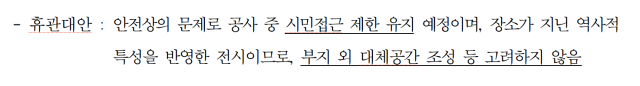 문제는 전시관을 장기간 휴관하면서도 어떠한 대안도 내놓지 않았다는 점이다. 서울시는 다음 달 19일 선고가 예정된 재판에서 승소할 경우 2027년 상반기 곤돌라 준공 시점에 맞춰 전시관을 재개장할 예정이다. 시가 패소해 상급심으로 넘어갈 경우 전시관은 기약 없이 휴관하는 셈이 된다. 아울러 시는 서미화 의원실에 "(중정 6국이라는) 장소가 지닌 역사적 특성을 반영한 전시기 때문에 대체공간 조성 등의 대안을 고려하지 않았다"고 밝혔다.