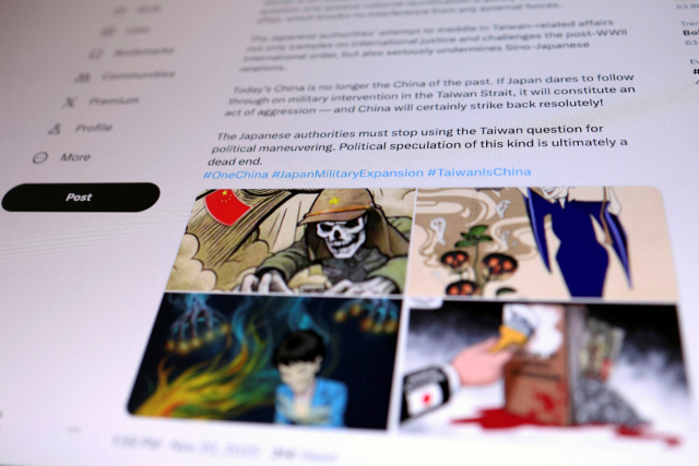필리핀 마닐라 주재 중국 대사관은 20일 소셜미디어(SNS)에 다카이치 총리를 일본 군국주의에 물을 주는 마녀로 묘사한 그림 등을 싣고 "오늘날의 중국은 더 이상 과거의 중국이 아니다"라며 "만약 일본이 감히 대만 해협에 군사 개입을 감행한다면 이는 침략 행위로 여겨질 것이며 중국은 분명히 단호히 반격할 것"이라고 밝혔다.