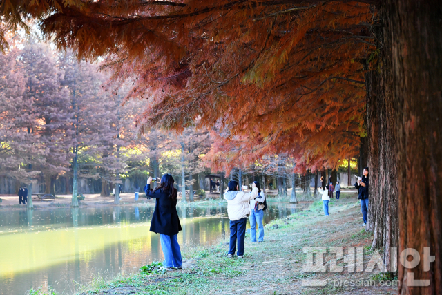 가로수 인근의 수면에는 나무와 단풍의 색감이 고스란히 반사돼 한층 더 깊은 가을 정취를 연출하고 있다.