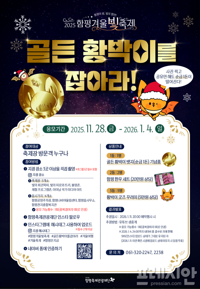 함평축제관광재단 관계자는 "이번 축제는 군민과 관광객이 함께 즐기는 참여형 콘텐츠를 대폭 강화했다"며 "'황박이를 잡아라' 이벤트가 함평을 찾은 이들에게 특별한 연말 선물이 되길 기대한다"고 말했다.