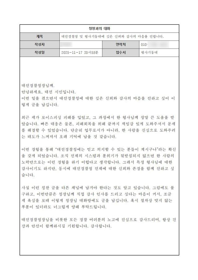 2일 대전경찰청에 따르면 피해자 A 씨는 최근 경찰청 누리집 ‘청정과의 대화’에 글을 올려 “대전경찰청과 형사기동대에 깊은 신뢰와 감사를 전한다”며 “업무 이상의 진심을 느꼈다”는 글을 남겼다.