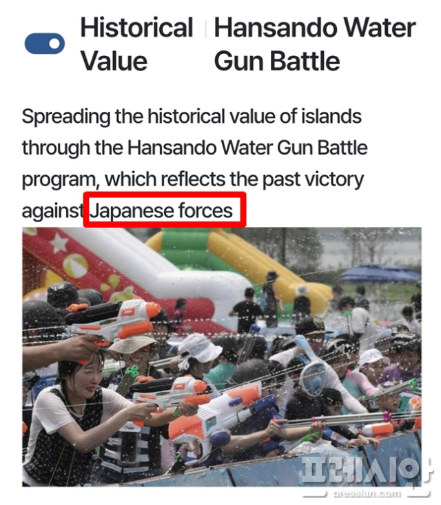 이어 해당 프로그램명 아래 'spreading the historical value of islands through the Hansando Water Gun Battle program, which reflects the past victory against Japanese forces' 내용의 소개글이 담겼다.