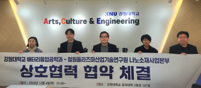 강원대학교(총장 정재연) 문화예술·공과대학 배터리융합공학과(학과장 김영진)는 4일 철원플라즈마산업기술연구원(원장 황명근) 나노소재사업본부(본부장 최선용)와 ‘지역전략산업 육성 및 혁신 인재 양성’을 위한 업무협약을 체결했다.
