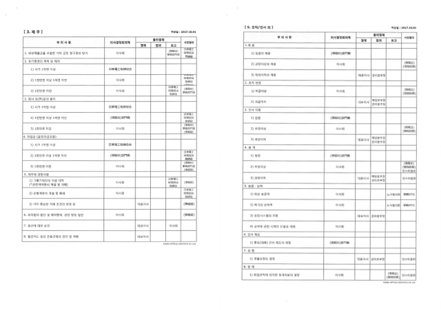 인사권도 한국옵티칼이 독립적으로 행사할 수 없었다. 조직·인사 부문 의사결정 기준을 보면, 임원 이상 채용·조직 변경·인사 이동·승격 권한은 정보재 회의에 있었다. 과장 이상 채용, 부급 이상 조직 변경, 부장 이상 인사 이동·승격도 정보재 회의에서 사전 협의를 거쳐야 가능했다.