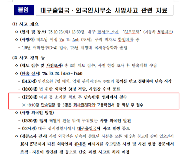 지난 10월 대구출입국·외국인사무소 단속 과정에서 사망한 베트남 유학생 부뚜안 씨 사건과 관련해, 법무부의 기존 설명과 상충하는 정황들이 잇따라 드러나고 있다. 당일 단속반원이 철수했다고 밝힌 시점보다 30분이 지난 뒤에도 출입국 소속으로 추정되는 차량이 인근 CCTV에 포착됐다. 아울러 법무부가 공식적으로 밝힌 단속 종료 시각도 여러 차례 수정되고 있다.