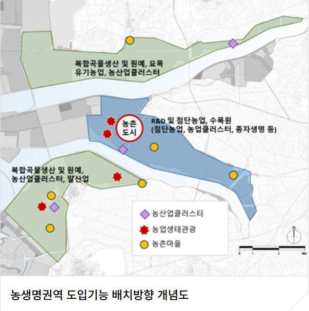 새만금개발청은 이 농생명권역을 "첨단농업 시험연구, 농산업클러스터, 스마트팜 조성 등을 통해 고부가 스마트농업의 전진기지로 활용하며 밀·콩 등 수입 의존이 높은 작물 생산으로 자급률 제고하고, 식품산업의 안정적 원료 조달 및 친환경 농산물 공급하며 수목원·농업테마파크·말산업 등을 연계한 농업생태관광 및 쾌적한 농촌 정주공간으로 조성하겠다"고 밝히고 있다.