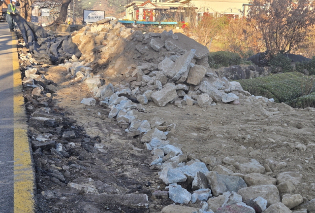 현장 대리인은 "현장의 돌무더기 등은 오래 방치해둔 것이 아니라 공사를 진행한 당일분을 모아 다음날에라도 곧바로 치우고 있다"며 "도로 확장을 위한 공사 일부가 오늘 마무리돼 26일경에는 주민분들이 통행할 수 있도록 조치할 계획이다"고 전했다.