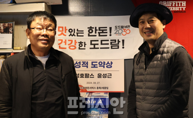 ▲남다른 기부로 선행을 베풀고 있는 세종시 부강면 성호팜스 윤성근 대표(왼쪽)과 아들 호진 전무. ⓒ프레시안(김규철)