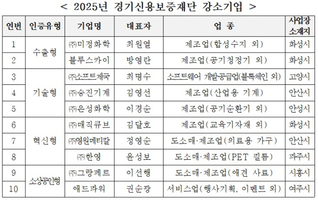 경기신보가 이날 발표한 강소기업은 ㈜미정화학, 블루스카이, ㈜소프트제국, ㈜승진기계, ㈜은성화학, ㈜매직큐브, ㈜영원메티칼, ㈜한영, ㈜그랑페르, 애드파워 등 10곳이다.