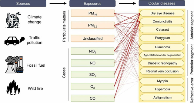 연구팀은 총 3324편의 문헌을 검토한 뒤, 103편의 역학연구와 22편의 동물실험연구를 바탕으로 대기오염과 안질환의 연관성을 지도 형태로 표현했다.