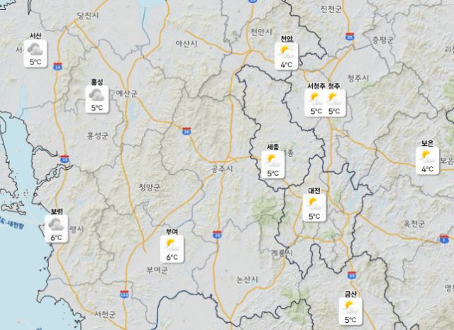 이날 낮 최고기온은 대전·천안 3도, 세종·청주 4도로 예보됐으며 아침 최저기온은 -2도 안팎에 머물 전망이다.