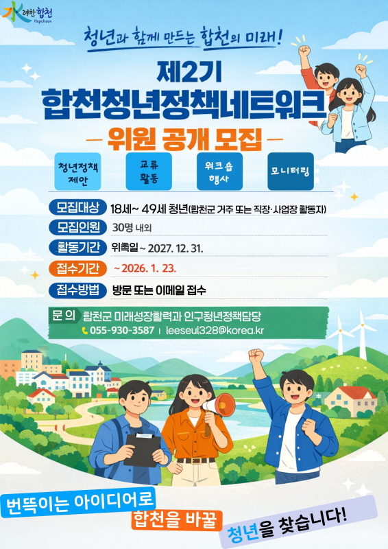 경남 합천군은 청년들의 다양한 목소리를 군정에 반영하고 청년정책 추진을 위한 소통 창구를 강화하기 위해 제2기 '합천청년정책네트워크' 위원을 오는 23일까지 공개 모집한다고 8일 밝혔다.