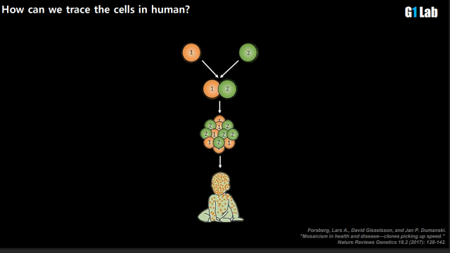 오 교수는 왜 이런 작업을 하나? 우리 몸에 있는 세포들의 조상 세포를 역추적하기 위해서다. 역추적하면 몸에 있는 모든 세포가 어떤 조상 세포에서 기원했는지를 알 수 있다. 역추적을 위해 '체세포 모자이크 현상'을 이용한다. 우리 몸의 세포들이 각각 갖고 있는 유전자책, 즉 유전체(whole genome) 내용이 일부 조금씩 다르고, 이를 '체세포 모자이크 현상'이라고 한다. 종전에는 한 사람의 몸 안에 있는 세포들은 같은 유전체를 갖고 있다고 알았으나, 이게 달라졌다. 옛 교과서는 틀렸다.