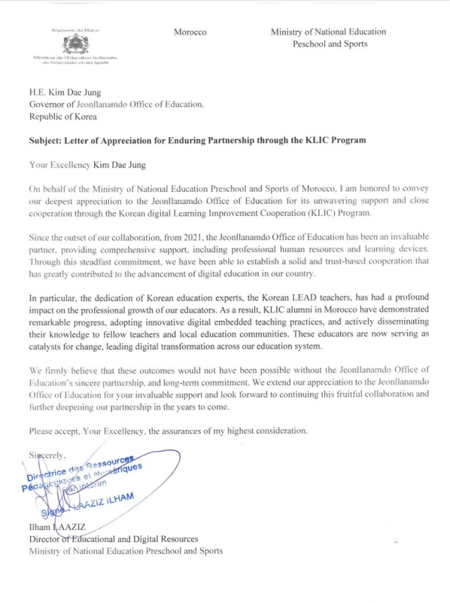 감사 서한에는 "교육 정보화 지원 사업 (KLIC·Korean Digital-Learning Improvement Cooperation)을 통해 변합없는 지원과 긴밀한 협력을 보내준 전남도교육청에 감사한다"면서 "한국 교육 전문가인 교사들의 헌신은 (모로코) 우리 교육자들의 전문성 향상에 지대한 영향을 미쳤다"는 내용의 감사 글이 기재됐다.