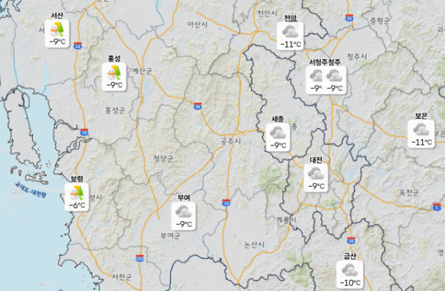 12일 낮 최고기온은 대전 3도, 세종·청주·천안 4도로 예보됐고 아침 최저기온은 -11도까지 떨어질 전망이다.