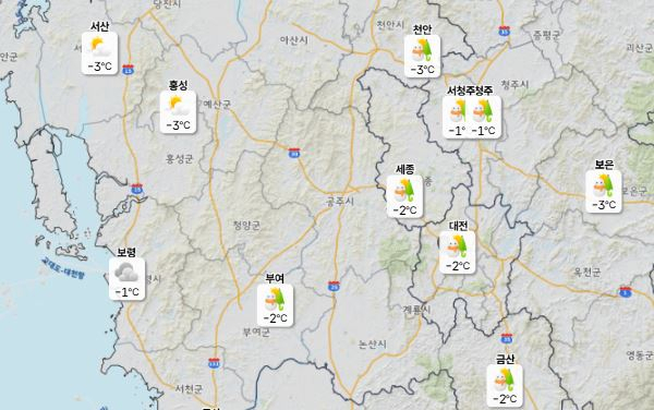 이날 낮 최고기온은 대전·청주 0도, 세종 1도, 천안 -1도로 예보됐으며 아침 최저기온은 -2도 안팎이 될 것으로 보인다.