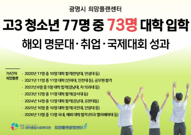 광명시는 광명시립 하안종합사회복지관이 운영하는 희망플랜광명센터가 가정의 경제·사회적 여건으로 진로 준비에 어려움을 겪는 청소년과 청년을 대상으로 장기적, 체계적 지원을 이어오며 안정적인 성과를 내고 있다고 22일 밝혔다.